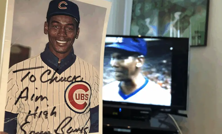 The legendary frontman and activist is holding up an autographed picture of Ernie Banks with the inscription, “To Chuck, Aim High.”